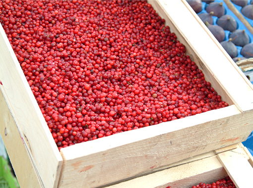 この写真は市場で売られていたリンゴン・ベリーですが、ベリーの中では収穫量が多く、このリンゴンには驚くほどのビタミンEとマンガンが含まれており、ポリフェノール、レスペラトールなどは赤ワインに匹敵するらしいです。地元ではジャムやソース、ジュースなどにして、肉料理を中心とした様々な伝統料理の付け合わせに無くてはならない植物のようです。リンゴンに含まれる安息香酸は防腐剤を必要とせず、生のまま砂糖と混ぜてジャムにする場合もあるらしいです。