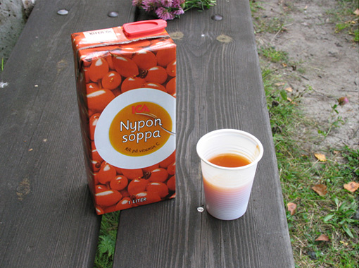 共稼ぎの多いスウェーデンでは「料理は箱から作る」というジョークもあるほどに、男女隔たり無く料理をするので簡単にできる料理がとても盛んであると笑いながらおっしゃっていました。例としての写真、ニッポン・ソッパと聞こえたジュースです。実はニィーポンと発音するらしいのですが日本人にはニッポンと聞こえてしまいます。このニィーポンはスウェーデン語でローズヒップになるルゴサと言うバラ科の植物で、原産は日本のハマナスだそうです。
