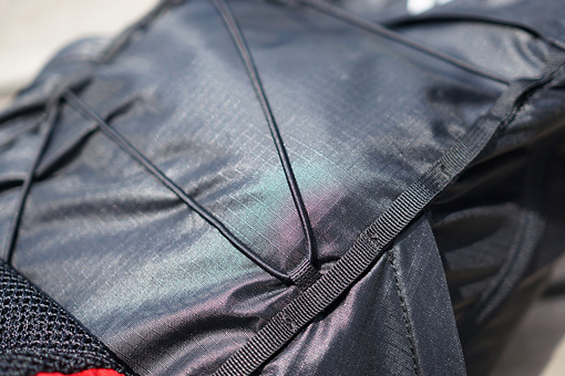 そして秀逸な出来栄えなのが左右に配されたドリンクポケット。片方だけで500mlのペットボトルが2本余裕で入るサイズで、ドリンクだけでなく一時的に増えてしまった荷物などを収納しておくにも十分な容量です。ポケットのサイズはゴムコードを引っ張ることで調整可能なので、途中で落としてしまう心配も軽減されます。