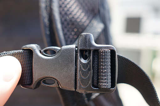 こだわりといえば、他にもあります。背負ったときのバックパックの安定性を向上させるチェストストラップのバックルに、もしもの時のホイッスルがついているのも見逃せないポイントです。