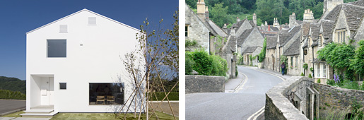 「無印良品の家─窓の家─」では、17世紀イギリスのコッツエルズ地方の家のかたちがお手本になりました。それは、絵本から飛び出してきたような町でした。三角形の屋根に小さな窓は、まさに、こどもが絵に描く家そのもの。そして、窓の周りをバラが飾っていました。誰がつくったのかは、わかりません。日常の暮らしの中から、自然に生まれたかたちだったのでしょう。