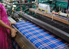 草木染めの先染め織物から始まったマドラスは、現在では化学染料を駆使し、世界中からの大量の需要にこたえる生産地として知られています。マドラスは縦(経)縞ストライプが生産の70%だったという時代から横(緯)縞が加わり縦横の格子柄が半々となるような経緯をたどってきました。初期の堅牢度の弱い染色で色がにじみ出るのが問題にされたり、それが逆にマドラスらしさと受けとめられてもいます。絣の故郷はここという説が生まれるのもマドラスで、大柄のコンテンポラリー・イカット(現代絣)はデザイナーの意欲をそそる素材となっています。