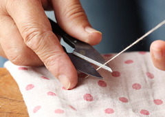 裁縫用の糸切りばさみは全長105㎜のものが標準で、150㎜まで数種類。一見どれも同じようですが、用途に応じて、長さや腰のバネの調子を違えてあります。そして最も大切なところは刃先。ここがピッタリと合わさってこそ、細かい針目も糸だけ引っ掛けて切ることができるのです。買うときは「手に取って握ってみて、使い心地のよいものを選んでほしい」と、刃物の専門家は言います。最近はパック入りで売られているものも多いのですが、刃物専門店などでは布を切ってみて、切れ味や握りやすさを確かめることもできます。また、ハガネをつけてたたいて作ったものなら、研ぎ直すことができるので「一生もの」として使えるでしょう。