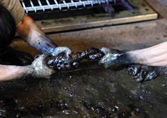 江戸時代から続く伝統的な藍染めは、「灰汁醗酵建(あくはっこうだて)」と呼ばれます。タデアイの葉を100日かけて発酵させて「すくも(染料のもと)」をつくり、それをさらに、藍甕(あいがめ)の中で灰汁(あく)やフスマ、石灰、酒などと共に発酵させ、その液の中で何度も染め重ねるという技法。四季のある日本で、一年中藍染めができるように考え出された、日本独自の技術です。この技法で染めるには、気の遠くなるような手間と時間がかかりますし、藍の機嫌をうかがいながら常に調整していくという職人技も必要とされます。