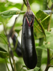 アメリカの品種を日本で改良したのは「米茄子」。茄子の英語名「エッグプラント」そのままの大きな卵形で、皮がかたく、果肉も締まっています。加熱しても崩れにくいので、煮物や焼き物に。ほかの品種と異なり、へたが緑色をしているのも特徴です。