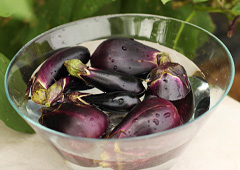 関東から東北地方にかけて多いのは、中長の卵形をした「千両茄子」。漬物・焼き物・煮物と、なんでもござれの万能選手です。ひょろりと長い「長茄子」は、西日本の人気者。皮がやわらかいので漬物や塩もみに適し、加熱料理にも。九州を中心につくられているのは、長さ30cmから40~45cmにもなる「大長茄子」。皮がかためで果肉はやわらかいので、焼きなすや煮なすなどの加熱調理向きです。京都の加茂なすに代表される丸形のものは「丸茄子」。果肉の締まりがよいので田楽や煮物に向いています。丸形もグンと小粒になると、「小丸茄子」または「ひと口茄子」。皮がやわらかく種も少ないので、そのまま漬物にされることが多く、辛子漬けなどでおなじみです。