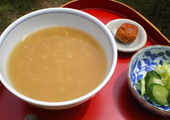 白粥がお米と水だけで炊き上げるのに対して、焙じ茶で香ばしく炊き上げるのが「茶粥」。奈良の僧房で食べられていたものが民衆に広がったといわれ、東大寺二月堂の「お水取り」でも、こもりの僧たちの夜食に「ごぼ」という茶粥が出されます。