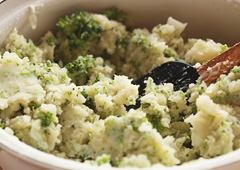 多くの場合、ポテトサラダの副材に使われる緑の野菜はキュウリです。惣菜売場に並ぶ市販のポテトサラダにも、たいていはキュウリが入っています。冬のキュウリは値段が高いからでしょうか。市販のポテトサラダでは、冬になるとキュウリの量がかなり減って「申し訳」程度になっているものも多いようです。そうまでして、キュウリにこだわる理由は何でしょう? たしかに、つぶしたポテトの中にシャキシャキのキュウリの食感というのは捨てがたい魅力ではあります。でも、キュウリは夏野菜の代表選手。身体を冷やす成分も含まれるウリ科の野菜は、暑い夏には有効ですが、寒い季節にわざわざ選んで使うこともなさそうです。ポテトサラダ以外のサラダでは、季節ごとに出回る野菜を使うことの多い私たちですが、ことポテトサラダとなると、「緑はキュウリ」という固定観念から抜け出せないでいるかもしれません。