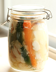一方、米糠などが手に入らない海外駐在員の奥さんたちは、ビールとパンと塩で漬物を作るといいます。食パンかフランスパンをちぎって瓶に入れ、ビールを注ぎ、塩を加えて漬け床に。そこに野菜を漬け込めば、糠漬けと粕漬けの中間くらいの味の漬物に仕上がるのだとか。そういえばビールもパンも、酵母の力を借りて作る発酵食品ですね。