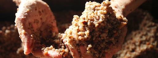 大豆と塩と麹だけでつくる味噌は、仕込みの作業もいたってシンプルです。煮大豆をつぶして塩・麹と混ぜ合わせ、団子状の塊にしたそれを容器に詰めるだけ。そして4~5ヵ月後に、一度ふたを開けて上下をひっくり返す「天地返し」を行い、あとはひたすら熟成の時を待ちます。その間に仕事をしてくれるのは、カビの一種である麹菌。目に見えない小さな生きものが活動して発酵を促し、半年から1年後には、うま味や香りのある味噌に変わっているのです。
