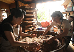 その違いは、ワークショップなどで一緒に仕込んだ人がそれぞれの家に持ち帰り、1年後に「手前味噌」を持ち寄って食べ比べをしてみると、よくわかるとか。同じ場所で同じ材料で同じ方法で仕込んだはずなのに、大きく、あるいは微妙に、味が異なるというのです。仕込んだ味噌樽を持ち帰って寝かせた場所の温度や湿度や風通し、もしかしたら、その家の空気まで影響しているのかもしれません。味噌はまさに、風土が醸す味。家風という言葉があるように、家ごとに風土も違い、それがそのまま味に反映されるのでしょうか。