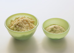 ところが、ここにきて、その「おから」が見直され、急速に地位が上がってきているといいます。それに一役かったのは、「乾燥おから」。おからの栄養素はそのままに、脱水加工して粉末状にし、いつでも使えるようにしたものです。この乾燥おからを、さらに細かい粉状にしたものが「おからパウダー」。いずれにせよ、水分を飛ばしてあるので常温で長期保存できますし、小麦粉やパン粉代わりに使うこともできます。パンやお菓子に入れたり、ハンバーグに加えてボリュームアップしたり、コロッケやポテトサラダのポテト代わりにしたりと、使い方はいろいろ。また、水を加えれば4~5倍にふくらんで、生のおからのようにも使えます。以前、ミュージシャンの藤井フミヤさんがテレビ番組の中で披露していたのは、「おから餃子」。おからが具材の余分な水分を吸ってくれるので、とても包みやすいとか。「おから」は、調理のときに包丁を使う必要がないため「きらず(切らず)」という別名があるくらい、扱いやすい食材。粉末タイプのものを、防災用の非常袋などにしのばせておくのもいいかもしれません。