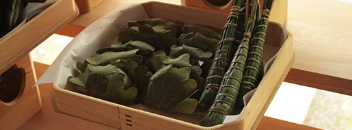 一方の柏餅は、江戸時代に始まった、日本独自のもの。餅を包む柏の葉は、新芽が出るまで古くなった葉が落ちないところから、家系が絶えない、つまり子孫繁栄の縁起物として使われたといいます。もっとも、そのずっと以前から、柏の葉は神様にお供えものをするときの器として使われてきた神聖な植物。柏餅にせよ粽にせよ、ある種の力を持つ葉っぱに包むことで、邪気を祓う食べものとなったのかもしれません。