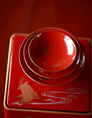 正式には、「屠蘇器(とそき)」と呼ばれる朱塗りか錫(すず)などのお銚子と三段重ねの盃でいただきますが、ない場合は、徳利と猪口(ちょこ)やぐい呑みなどを「屠蘇器揃い」に見立てるのもよいでしょう。お銚子や徳利にもお正月飾りや水引をつけると年神様が降りる目印になるとされ、一つのお盆に組み揃えると新年を寿ぐ風情になります。