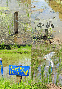 ロープで仕切られた一区画ごとに立てられているのは、田んぼの表札ともいうべき看板。竹を割って手書きしたもの、木の板に木の枝を貼り付けた工作風のもの、カラフルなペンキで彩ったものと人それぞれで、「私の田んぼ」を主張しているようです。時おり吹き抜ける風の動きにつれてカラカラと音を立てて回るのは、モグラ除けのために手作りしたというペットボトルのプロペラ。近くには子どもたちが作りかけの竹製ベンチもあり、田んぼがアソビの場でもあることを感じさせます。