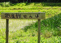 奥さんの動きが止まったので足元を見ると、田んぼの中に座り込んで動かない大ガエルを踏まないよう気遣っている様子。「ここの主みたいで」と笑います。農薬も何も使っていない田んぼは多様な生物の宝庫。オタマジャクシやカエルはもちろん、バッタ、ドジョウ、アメンボ、ゲンゴロウ、アカハライモリ