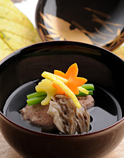 食材やあしらいの色だけでなく、お膳や器の色など、しつらえも含めた色合いを大切にし、食欲増進、清潔感、安心感といった意味まで込められているのです。日本の茶室は明度と彩度を抑えた「色を見るための色」、つまり「捨て色」で造られているといいます。そうした色を背景に、利休は楽茶碗の赤と黒に抹茶の緑を対比させたのだとか。懐石料理の色もまた、茶室という空間のなかで美しく映える演出がなされているのかもしれません。「日本料理は目で味わう」といわれるゆえんです。