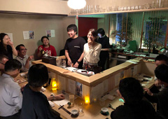 卒業して京都を巣立った三人は、就職のため散り散りに。社会人1年生の間は、自分の仕事を覚えるのに精いっぱいでしたが、そのうち「やっぱり、きっかけ食堂をやりたい」という思いがふつふつと湧いてきたそうです。そして、社会人になって2年目の2018年4月。東京に就職した原田さんと右近さんは、東京できっかけ食堂を立ち上げます。発足メンバーに加わったのは、京都時代にお客として訪れていた弘田光聖さん。その後、他のメンバーも加わって、今では総勢8人になりました。開店場所は、地域の魅力を紹介する渋谷の日本酒バーMYSH Sake Bar。この活動に共感した代表が「ウチを使っていいよ」と声をかけてくれたといいます。