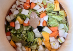 同じようにファイトケミカルをたっぷり含むのが、野菜でとる出汁、「ベジブロス」。「ベジタブル(野菜)」と「ブロス(だし)」を組み合わせた造語です。野菜といっても、使うのは皮や種、ヘタなど、ふだんは野菜くずとして捨てられる部分。「いのちの野菜スープ」とほぼ同じ要領で作りますが、最後に野菜を漉して使います。