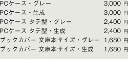 ブックカバー 文庫本サイズ・グレー 1,680円 ブックカバー 文庫本サイズ・生成 1,680円 PCケース タテ型・グレー 2,400円 PCケース タテ型・生成 2,400円 PCケース・グレー 3,000円 PCケース・生成 3,000円