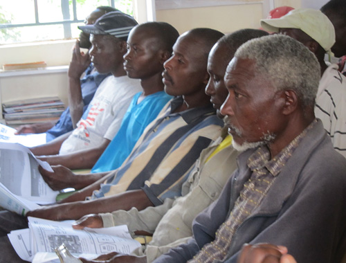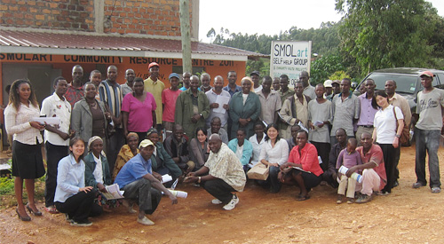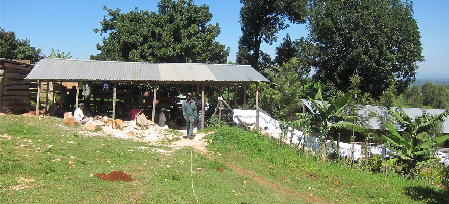 A green landscape extends from a workshop housing producers.May in Kenya's Kisii District is the rainy season, but there are sunny intervals when the rain stops. The climate is cool in the morning and evening, but hot during the daytime.