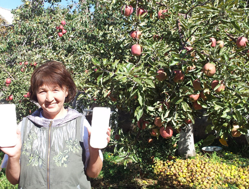 Picture: Ms. Zamira with her products in an apple field. Kyrgyz is famous for apples.