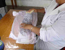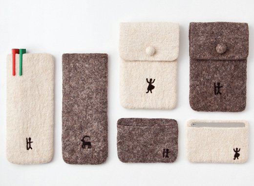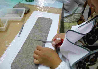 The production of the felt case starts with weighing the wool for material. Then, the wool is multi-layered on the template and shaped while being moistened with soap water. This shaping process takes long time. The shaped wool is washed more with water before being dried. The end product requires other operations such as removing threads in color similar to that of a hair strand with tweezers, cutting out the possible pilling on the surface with a razor, and scoping out the felt lint in the case with a toothbrush.