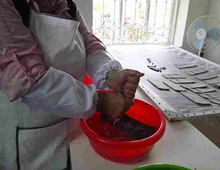 During the production process of the pen case, mobile device case, and card case, one product was produced at a time until last year. To streamline the local production this year, members with technical skills developed an efficient method to produce two at a time and forwarded it to all members in production. The secret was creating a unique plastic template that allows for making two products simultaneously in one process.