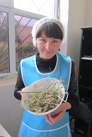 Starting from this year, the Kyrgyz members have started vegetable dyeing using the color of a natural material in Kyrgyz, as well as the undyed color. This plant of sainfoin has many characteristics; its flowers provide honey for bees, it is used as livestock feed after being cropped in July, and planting it improves the soil. Now we have made products using sainfoin that can be seen a lot in Kyrgyz. It is our "choice of a material," which is friendly to the nature.