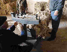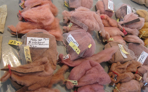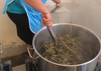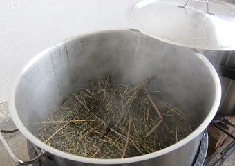 The large pot is filled with sainfoin for boiling to extract dye. The dyeing process takes about three days, but the dyeing technique has been improved through various experiments.