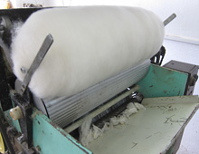 After the wool is sheared from sheep, dirt is removed from the wool. Then, the wool is washed and processed into fluffy cotton called carding.