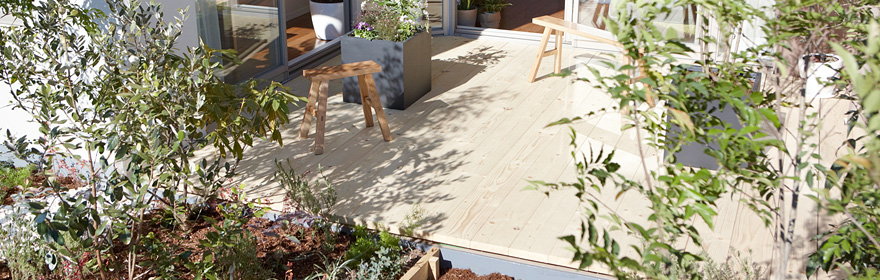 - 森に面する専用庭を実際にモデルルーム内につくってみました。庭から部屋の中につながる、緑のある暮らし。家具は無印良品とイデーでコーディネート。バルコニーは花良品が提案するベランダ用のデッキ材やベンチなどでつくってみました。2010年から提案しているバルコニー菜園もここで行う予定です。このプロジェクトでは緑のある暮らしをみなさんと一緒に考えていきたいと思います。
