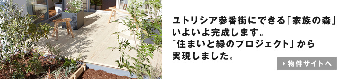 千葉習志野市に誕生する1453戸の大規模マンション「ユトリシア参番街」、その中央に大きな森ができます。プロジェクトの名前は「家族の森」、1haを超える大きな森です。その森に面した住戸には専用庭や広いバルコニーなどがあり緑に囲まれた暮らしができます。事業主は有楽土地株式会社を中心とするデベロッパー6社による大型プロジェクト。無印良品では、ずっと考えてきた緑の暮らしを、このプロジェクトの中で提案しています。
