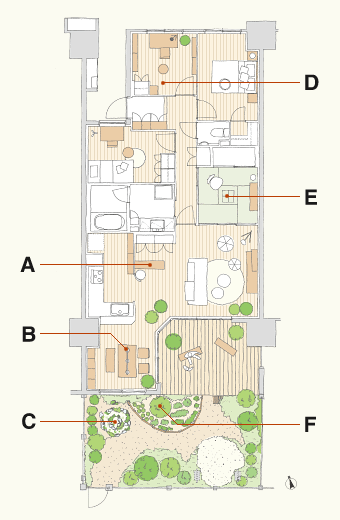 - A.キッチンシェルフのあるコーナー 背の低いシェルフは緑を飾ったり、小さな椅子を置いてレシピを研究するコーナーにしても。 B.緑の中のダイニング 2面に大きな窓のあるダイニングは、まるで戸外にいるように緑の中で食事や団らんを楽しめます。 C.楽しいロックスパイラルガーデン 渦巻き状の石に沿って土を盛り上げたハーブガーデン。築山のようなかたちは見た目にも楽しいもの。 D.あこがれの書斎 デスクにお気に入りの音楽や蔵書。こんな落ち着ける空間があれば発想力も向上しそう。 E.静かに過ごすたたみの間 一つあると何かと重宝なたたみの部屋。客間や、くつろいでテレビを見る部屋にもなります。 F.新鮮な食材を育てる家庭菜園 トマトやナス、ピーマンなど、育てやすい種類から始めてはいかが。収穫のよろこびは格別です。