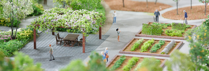 下の写真は家族の森の模型の写真です。この森に面して参番街の住棟は建てられています。