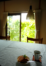 「涼やかな見た目」もポイントです。特に、緑のシェードの内側からシェード越しに眺める風景は、とても気持ちがいいものです。