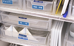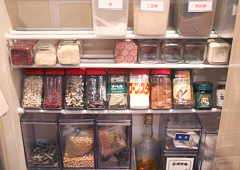 この達人のお宅では、写真のように、ストックしている調味料なども瓶やケースに詰め替えてあります。さらに、キッチン用には何日分か使う量を小分けして、小瓶だけを置くことにしています。そうすれば、キッチンでのスペースもとりません。収納をするとは、すぐに使える状態にしておくことなのだと感心させられます。