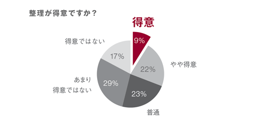 先日、くらしの良品研究所が行った収納についてのアンケート(※)では、全回答者の内9%の方から、「整理が得意」という答えが返ってきました。