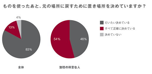 アンケート結果のグラフを見ると、多くの人が収納の場所を「だいたい」決めているのに対して、得意な人たちは「すべて正確に」決めているのがわかります。整理をしたときはきれいでも、日々の生活の中ではすぐに乱れてしまうもの。もとあった場所にちゃんと戻すといった日常の習慣と同時に、それを可能にする整理の工夫として、まずは「正確に場所を決める」ことが大切なようです。