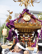 祭りと言えば、だれもが思い起こすのは神輿(みこし)です。神輿とは、神さまが乗る輿(こし=長柄で運ぶ乗り物)の意味。神輿を担ぐのは、神社にいる神さまを外へ連れ出して、家々の間を練り歩く儀式でした。