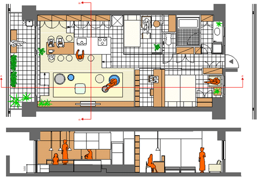 下の図面をご覧ください。以前「無印良品、みんなで考える住まいのかたち」のコーナーで紹介した間取りですが、キッチンや廊下は床の高さをそのままにして、床座のくらしの部分やテーブルのところを掘りごたつのようにして一段高いところに腰掛けるようにしてみました。