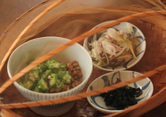 「三種の神器(白黒テレビ、電気洗濯機、電気冷蔵庫)」という言葉が流行った昭和30年代は、家電が急速に普及していった時代。昭和32年には2.8%だった電気冷蔵庫の保有率も、昭和40年には68.7%までになりました。それでも、そのころはまだ、食品のほとんどを冷蔵庫にしまうという習慣はなかったようです。現代の私たちは、「冷蔵庫にさえ入れておけば安心」とばかりに、何でもかんでも冷蔵庫に放り込んでしまいがち。たしかに、冷蔵庫に入れておけば、とりあえずは安心ですしハエがたかる心配もありません。でも、よくよく考えてみると、冷やす必要のない食べもの、冷やすと逆に味の落ちてしまう食べものもあるのではないでしょうか。食事時間がずれる家族の夕食などは、常温で一時保存するほうがおいしさを保てる気がします。といって、ハエがたかるのも困る。そんなとき、食べものを虫から護っていたのが、蠅帳(はいちょう・はえちょう)でした。