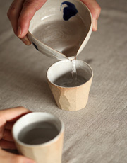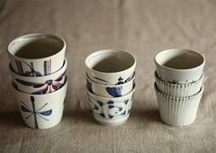 今では日常雑器の代表とされる猪口ですが、もともとは会席料理の向付(むこうづけ:膳の向う側に配する料理)として刺身や酢の物などを盛った器のこと。朱塗りのお椀と一緒に並べられるハレの器だったのですが、のちにそば屋で雑器として使うようになってから、「そば猪口」の愛称で呼ばれるようになったとか。大・中・小といろいろあり、大きさによって、そばつゆ用、天つゆ用、向付けや湯呑み、ぐい呑みなど、自由に用途を見立てて「一器多用」に使われてきました。一つのそば猪口が、湯呑みになり、おつまみや酢の物・おひたし・和え物などふだんのお惣菜を盛る器になる。現代なら、スープやアイスクリーム用のカップになったり、スティック野菜を挿すスタンドになることもあるでしょう。キャンドルスタンドや小さな植木鉢として使われることもあります。