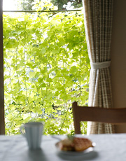 もうひとつ大事なことは、家の周りの放射熱を家の中に入れないこと。また、家の中の壁面の表面温度を上げない工夫も必要です。そのために専門家が勧めるのは、家の外に日除けをつけること。窓の外側にルーバーをつけられるようにしたり、すだれを掛けられるフックをつけたりするのもいいでしょう。ベランダなどの床面も熱くならないように、デッキを貼るとか、植栽をして日陰をつくります。こうした環境を調えたうえで窓を開けて風を通せば、暑い夏でもエアコンを使わずに、驚くほど快適な家が実現するといいます。