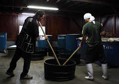以前のコラム「暮らしの中の歌」でもご紹介したことがありますが、千葉県にある自然酒づくりの酒蔵・寺田本家では、今でも蔵人たちが酒屋唄を歌いながらお酒を仕込んでいます。最初のうちは眠気醒ましのつもりだったようですが、歌いながら作業することで、「楽しくお酒をつくる」という想いに変わっていったとか。酒づくりは、酵母という小さな命(微生物)を相手にする仕事。人間の「きついな」という声を聞き続けた微生物が発酵させたお酒と、「楽しいな」という声を聞き続けた微生物が発酵させたお酒では、同じアルコールでも違うはず──そう信じて、蔵人たちは、自分たちの楽しい想いを歌で微生物に伝えています。