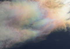 晴れた日の日中、太陽のそばにある白い雲がパステル調の輝きを帯びることがあります。このカラフルな雲は「彩雲(さいうん)」と呼ばれ、虹のような光の"屈折"ではなく、"回折"という現象によって生じます。色の区別は虹ほどハッキリせず、水彩でぼかしたにじみ絵のよう。古来中国では「瑞雲」や「慶雲」などと呼ばれ、良いことが起きる"吉兆"として尊ばれました。仏教の阿弥陀如来が極楽浄土から来迎するときに乗ってくる五色の雲も、この彩雲です。さほど珍しい現象ではなく、光と雲の条件さえ揃えば比較的よく見られるもの。晴れた日、日の光を浴びて輝いている雲があったら、近くの空を眺めてみてください。思わぬ吉兆に出会えるかもしれません。