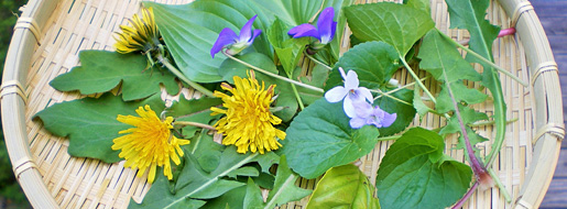 スミレの葉は、みそ味の煮汁でひと煮立ちさせて、お弁当のおかずに。スギナは、軽くゆでて水に晒して刻み、蒸したさつま芋や小麦粉と一緒につき混ぜて平たい饅頭に。ハコベはざく切りにして、じゃが芋入りのお粥の中に。タンポポの根は千切りに、葉はざく切りにして、うの花(おから)煮の具材に。カタバミは大根の塩もみに混ぜて...満腹感を得るための増量材としてだけでなく、野草がビタミン補給や彩りとしても使われていたことがわかります。
