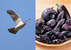 初夢に見て縁起がよいとされるのは、「一富士、二鷹、三茄子」といわれますが、なぜそうなったかについては諸説あります。そのうちのひとつは、将軍徳川家康に縁の深い駿河の国の名物を集めたという説で、日本最高峰の「富士山」、富士に棲む「鷹」、他国より早く採れる「初茄子」を並べたものといわれています。一方、東京文京区の本駒込にある「駒込富士神社」に起源があるという説も。江戸時代の富士山信仰の拠点のひとつであったこの神社の周辺には、鷹を調教する「鷹匠(たかじょう)」屋敷があり、名産品として「駒込茄子」があることを根拠としています。実際、「駒込は一富士二鷹三茄子」と詠まれた川柳もあるとか。他にも、富士は「無事」、鷹は「高い」、茄子は事を「成す」という掛けことばだったという説も。洒落好きな江戸っこだけに、この説にもうなずけます。