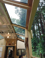 走る場所によって、風の匂い、水の匂いが変わるのがわかります。葉っぱが水を含んでいるところでは、青葉風と呼びたいような薫る風。日向の草刈りをしたばかりのところでは、草いきれ。小川に近づくと、また水の匂い。苔むした岩肌が迫ってくる切通しの断面からは絞り水が湧き出しています。窓がなく、時速25㎞というゆっくりしたスピードだからこそ感じとれる自然の息吹。都会の暮らしでは眠っていた五感が、ゆっくりとめざめていくようです。
