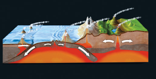 DCOの研究がもうひとつ明らかにしたのは、この地球には壮大なスケールの「炭素循環」のシステムがあるということでした。動物や植物に含まれる炭素は、その死骸の堆積した地層ごと、プレートの沈み込みによって地下深くに潜っていきます。やがて長い時を経て、これらの炭素は岩石や火山ガスの中の二酸化炭素となり、地表に戻ってきます。地球はまるで呼吸をするように、炭素を取り込んだり排出したりしてバランスを保っていたのです。そして、自然がつくりだしたこの巧妙な炭素循環を崩してしまったのが人間です。私たち人類は、地球が長い間かけて地下に閉じ込めてきた炭素を、石油や石炭、天然ガスなどを掘削することで地上に放出し、温暖化を招いてしまいました。